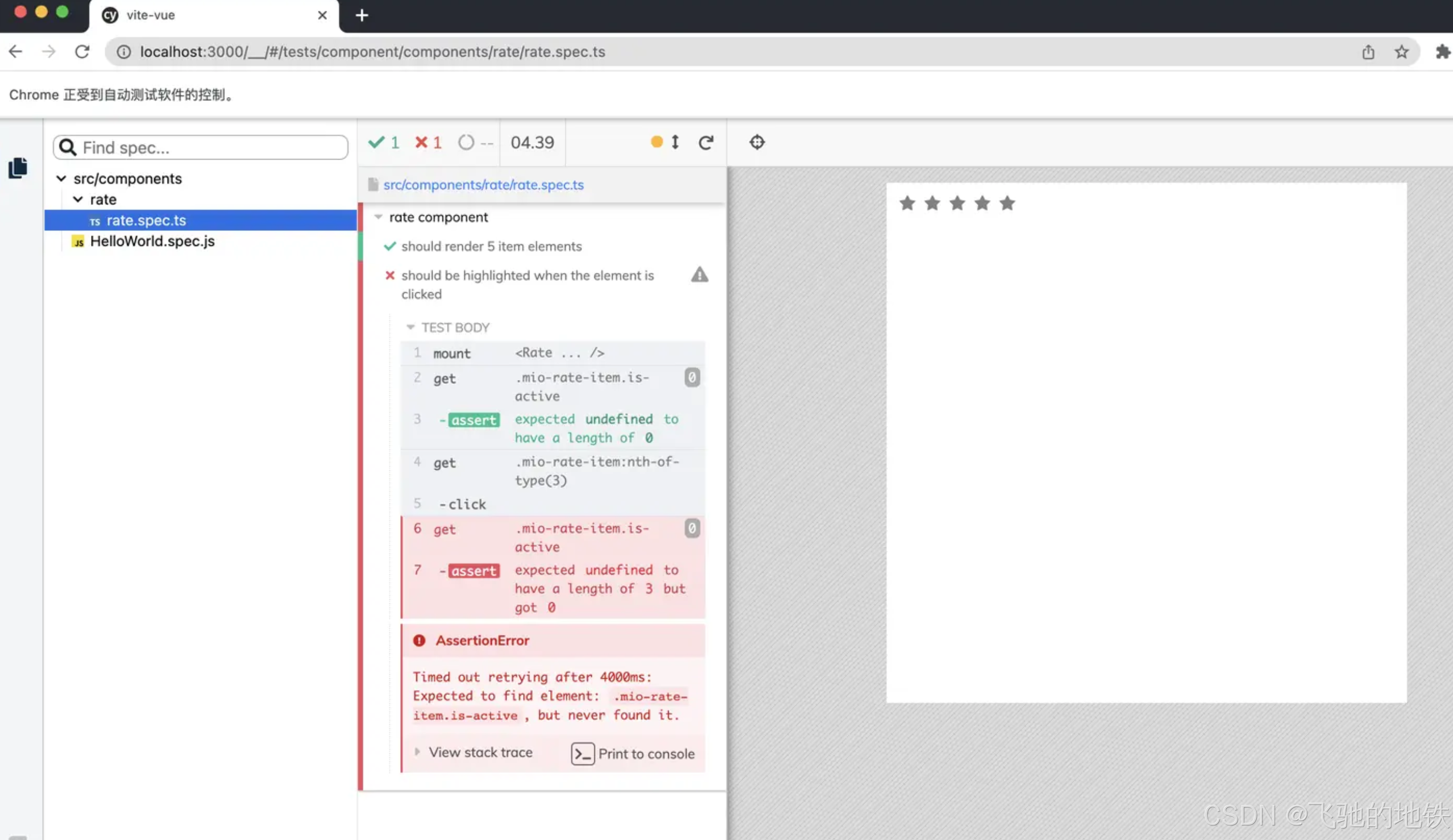 打开浏览器用例运行界面,可以看到左侧的用例列表多出来了 src/component/rate/rate.spec.ts ,且编译摆错了。